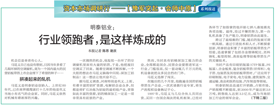 马廷义自己也没有想到,只因当年多看了几眼坏掉的空调窗机,竟为一个国内最大的民营铝板带箔上市企业埋下了希望的种子……(今日《郑州日报》1版、2版)