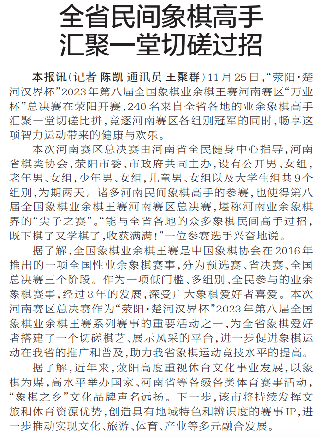 11月25日,“荥阳·楚河汉界杯”2023年第八届全国象棋业余棋王赛河南赛区“万业杯”总决赛在荥阳开赛,240名来自全省各地的业余象棋高手汇聚一堂切磋比拼,竞逐河南赛区各组别冠军的同时,畅享这项智力运动带来的健康与欢乐。(今日《郑州日报》2版)