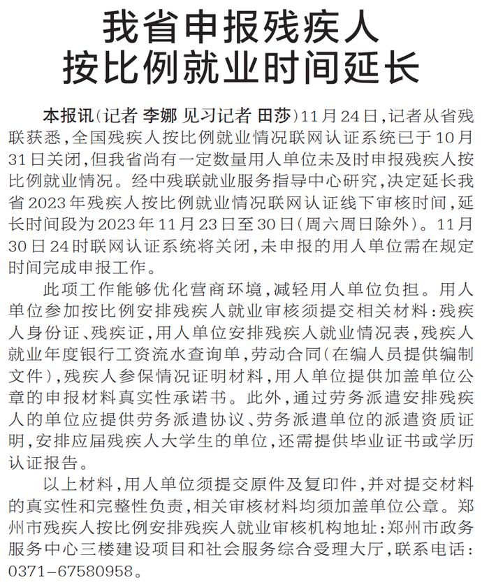 11月24日,记者从省残联获悉,全国残疾人按比例就业情况联网认证系统已于10月31日关闭,但我省尚有一定数量用人单位未及时申报残疾人按比例就业情况。经中残联就业服务指导中心研究,决定延长我省2023年残疾人按比例就业情况联网认证线下审核时间,延长时间段为2023年11月23日至30日(周六周日除外)。11月30日24时联网认证系统将关闭,未申报的用人单位需在规定时间完成申报工作。(今日《郑州日报》2版)