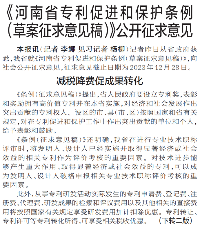 记者昨日从省政府获悉,我省就《河南省专利促进和保护条例(草案征求意见稿)》,向社会公开征求意见,征求意见截止日期为2023年12月28日。(今日《郑州日报》1版、2版)