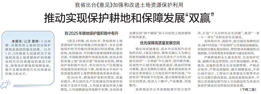 十分珍惜、合理利用土地和切实保护耕地是我国的基本国策。12月1日,《河南省人民政府关于加强和改进土地资源保护利用推动现代化河南建设的意见》印发,统筹保护耕地和保障发展,提升支撑保障现代化河南建设的能力和水平。(今日《郑州日报》1版、2版)