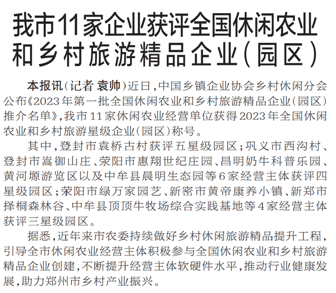 近日,中国乡镇企业协会乡村休闲分会公布《2023年第一批全国休闲农业和乡村旅游精品企业(园区)推介名单》,我市11家休闲农业经营单位获得2023年全国休闲农业和乡村旅游星级企业(园区)称号。(今日《郑州日报》1版)