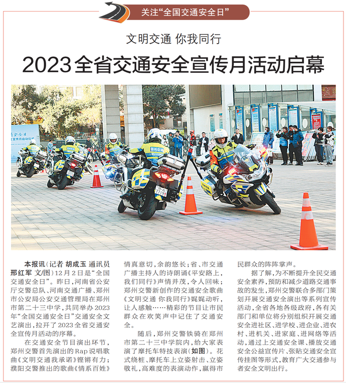 12月2日是“全国交通安全日”。昨日,河南省公安厅交警总队、河南交通广播、郑州市公安局公安交通管理局在郑州市第二十三中学,共同举办2023年“全国交通安全日”交通安全文艺演出,拉开了2023全省交通安全宣传月活动的序幕。(今日《郑州日报》2版)