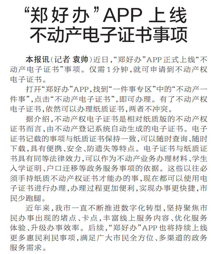 近日,“郑好办”APP正式上线“不动产电子证书”事项。仅需1分钟,就可申请到不动产权电子证书。(今日《郑州日报》2版)