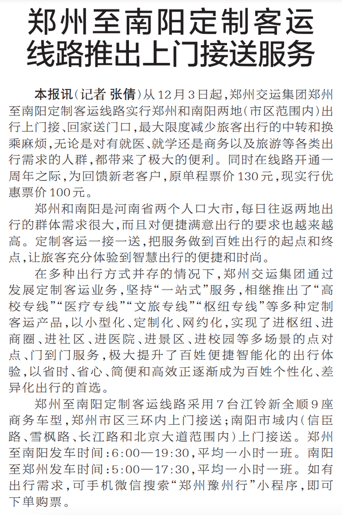 从12月3日起,郑州交运集团郑州至南阳定制客运线路实行郑州和南阳两地(市区范围内)出行上门接、回家送门口,最大限度减少旅客出行的中转和换乘麻烦,无论是对有就医、就学还是商务以及旅游等各类出行需求的人群,都带来了极大的便利。同时在线路开通一周年之际,为回馈新老客户,原单程票价130元,现实行优惠票价100元。(今日《郑州日报》2版)