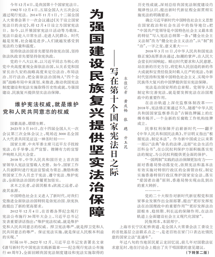 1982年12月4日,五届全国人大五次会议通过现行宪法。2014年11月1日,十二届全国人大常委会第十一次会议通过《关于设立国家宪法日的决定》,将12月4日设立为国家宪法日。如今,以开展国家宪法日活动等为载体,宪法日益走入日常生活、走进人民群众。时代越是发展,社会越是进步,人们就越发感受到宪法的力量和温度。(今日《人民日报》1版、2版)