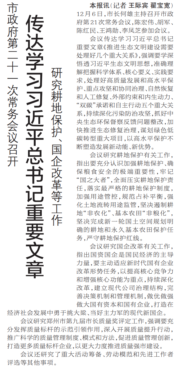 12月6日,市长何雄主持召开市政府第21次常务会议,陈宏伟、胡军、陈红民、王鸿勋、李凤芝参加会议。(今日《郑州日报》1版)
