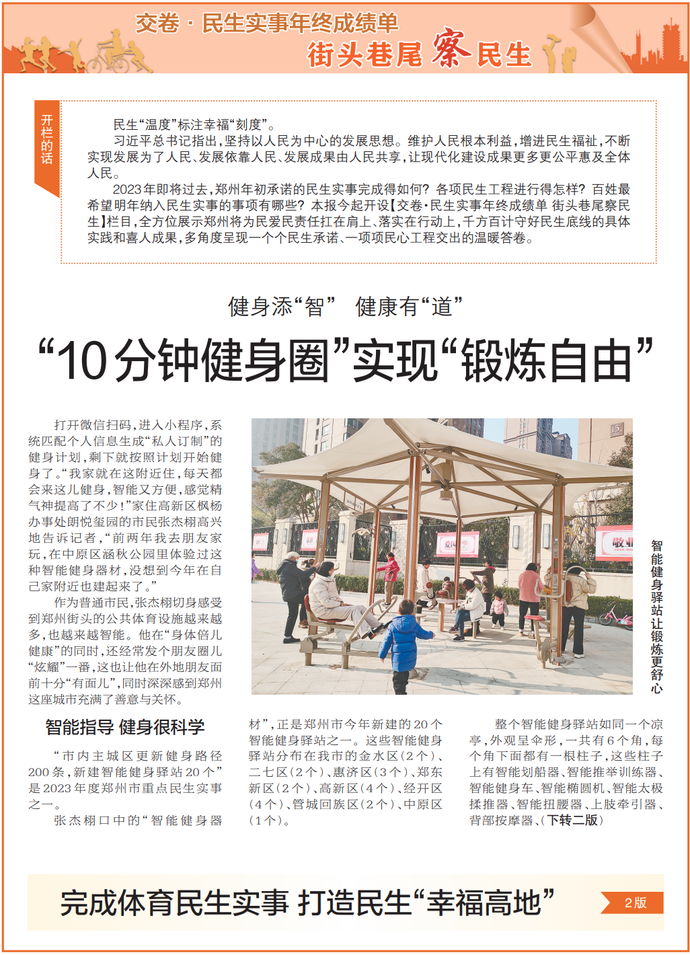 作为普通市民,张杰栩切身感受到郑州街头的公共体育设施越来越多,也越来越智能。他在“身体倍儿健康”的同时,还经常发个朋友圈儿“炫耀”一番,这也让他在外地朋友面前十分“有面儿”,同时深深感到郑州这座城市充满了善意与关怀。(今日《郑州日报》1版、2版)