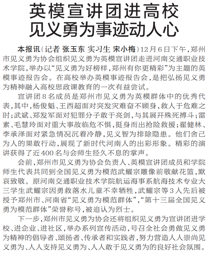 12月6日下午,郑州市见义勇为协会组织见义勇为英模宣讲团走进河南交通职业技术学院,举办以“见义勇为好榜样,郑州有你更精彩”为主题的英模事迹报告会。在高校举办英模事迹报告会,是把弘扬见义勇为精神融入高校思政课教育的一次有益尝试。(今日《郑州日报》2版)