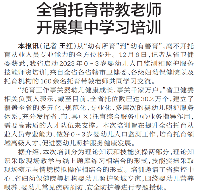 从“幼有所育”到“幼有善育”,离不开托育从业人员专业能力的全方位提升。12月6日,记者从省卫健委获悉,我省启动2023年0~3岁婴幼儿人口监测和照护服务技能师资培训,来自全省各省辖市卫健委、各级妇幼保健院以及托育机构的160余名托育带教老师共同学习交流。(今日《郑州日报》2版)