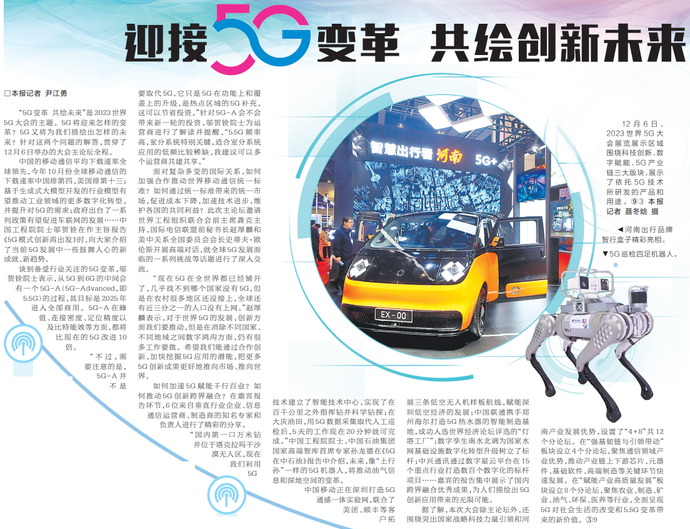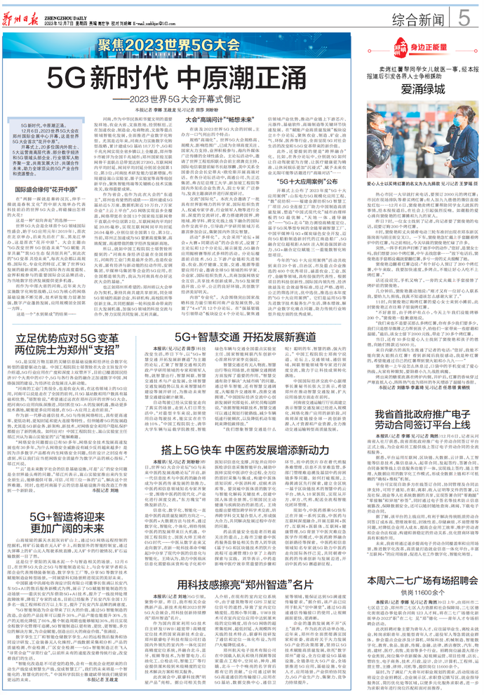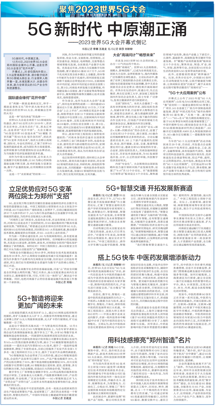 5G引领,聚势中原。昨日,我市相关企业携新产品、新技术亮相2023世界5G大会展会,用科技创新持续擦亮“郑州智造”名片。(今日《郑州日报》5版)