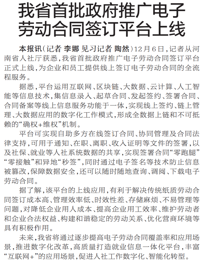 12月6日,记者从河南省人社厅获悉,我省首批政府推广电子劳动合同签订平台正式上线,为企业和员工提供线上签订电子劳动合同的全流程服务。(今日《郑州日报》5版)