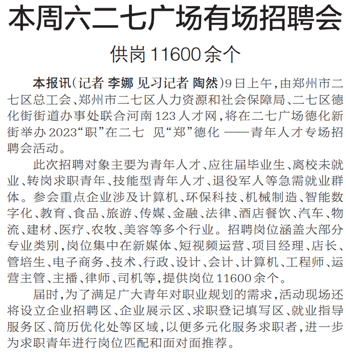 9日上午,由郑州市二七区总工会、郑州市二七区人力资源和社会保障局、二七区德化街街道办事处联合河南123人才网,将在二七广场德化新街举办2023“职”在二七 见“郑”德化 ——青年人才专场招聘会活动。(今日《郑州日报》5版)