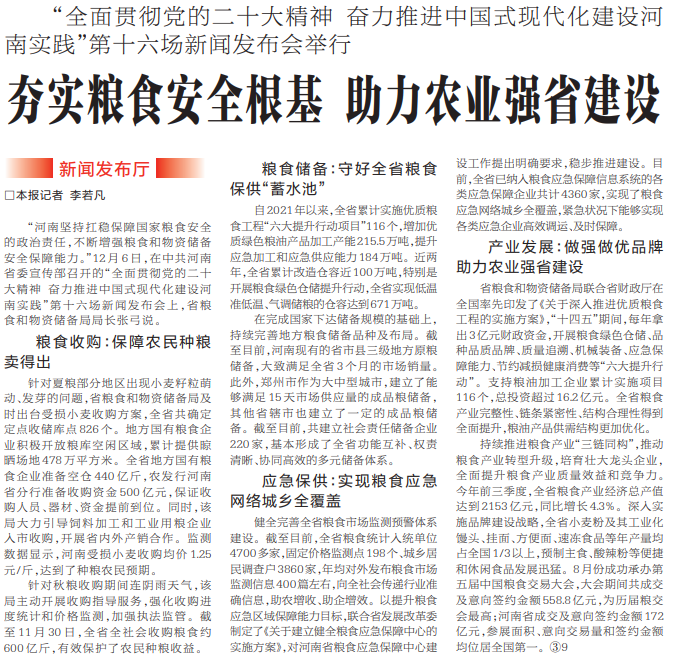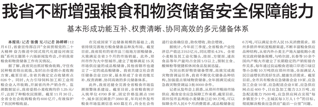 12月6日,省委宣传部召开“全面贯彻党的二十大精神 奋力推进中国式现代化建设河南实践”系列主题第十六场新闻发布会,介绍我省粮食和物资储备工作有关情况。(今日《郑州日报》6版)