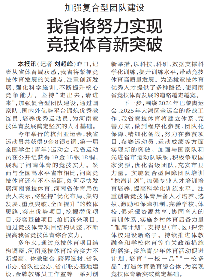 昨日,记者从省体育局获悉,我省将紧抓竞技体育发展的关键点,注重创新发展,强化科学施训,不断提升核心竞争能力。坚持“走出去,请进来”,加强复合型团队建设,通过国家队、国内外优势平台锻炼优秀教练员,培养优秀运动员,为河南竞技体育发展奠定坚实的人才基础。(今日《郑州日报》8版)