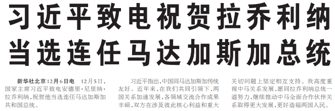 12月5日,国家主席习近平致电安德里·尼里纳·拉乔利纳,祝贺他当选连任马达加斯加共和国总统。(今日《人民日报》1版)