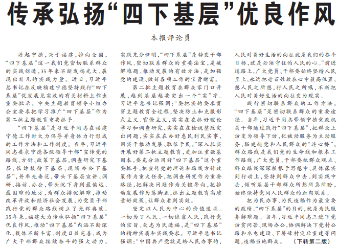 源起宁德,兴于福建,推向全国,“四下基层”这一我们党密切联系群众的实践创造,35年来不断发扬光大,展现出非凡的实践力量。近日,习近平总书记在反映福建宁德坚持践行“四下基层”促发展见实效的有关材料上作出重要批示。中央主题教育领导小组办公室要求把学习推广“四下基层”作为第二批主题教育重要抓手。(今日《人民日报》1版、2版)