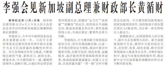 国务院总理李强12月6日上午在人民大会堂会见来华访问的新加坡副总理兼财政部长黄循财。(今日《人民日报》1版)