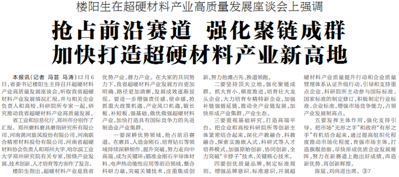 12月6日,省委书记楼阳生主持召开超硬材料产业高质量发展座谈会,听取我省超硬材料产业发展情况汇报,并与相关企业负责人和高校、科研院所专家一起,研究推动我省超硬材料产业高质量发展。(今日《河南日报》1版)