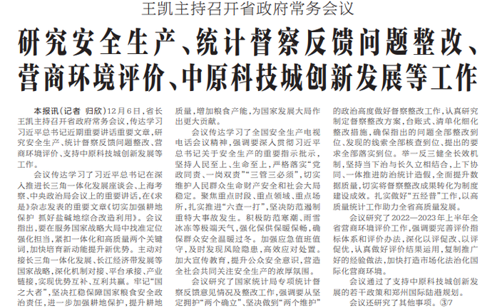 12月6日,省长王凯主持召开省政府常务会议,传达学习习近平总书记近期重要讲话重要文章,研究安全生产、统计督察反馈问题整改、营商环境评价、支持中原科技城创新发展等工作。(今日《河南日报》1版)