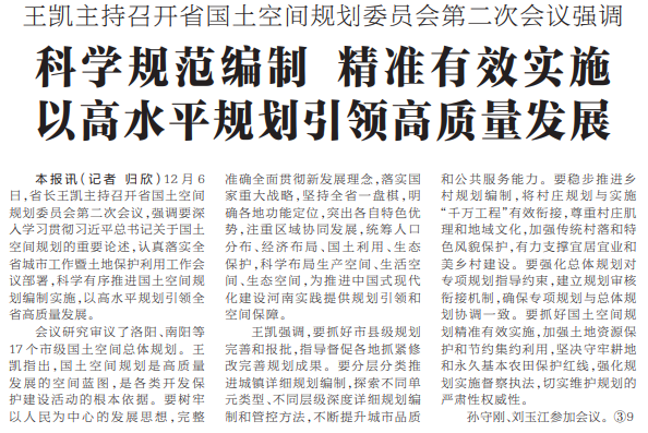 12月6日,省长王凯主持召开省国土空间规划委员会第二次会议,强调要深入学习贯彻习近平总书记关于国土空间规划的重要论述,认真落实全省城市工作暨土地保护利用工作会议部署,科学有序推进国土空间规划编制实施,以高水平规划引领全省高质量发展。(今日《河南日报》1版)