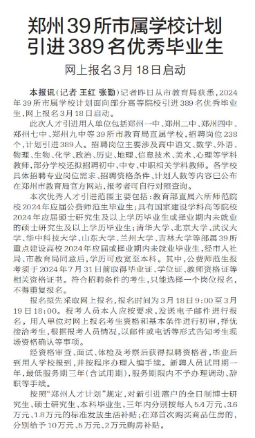 记者昨日从市教育局获悉,2024年39所市属学校计划面向部分高等院校引进389名优秀毕业生,网上报名3月18日启动。(今日《郑州日报》1版)