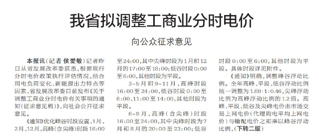 我省拟调整工商业分时电价