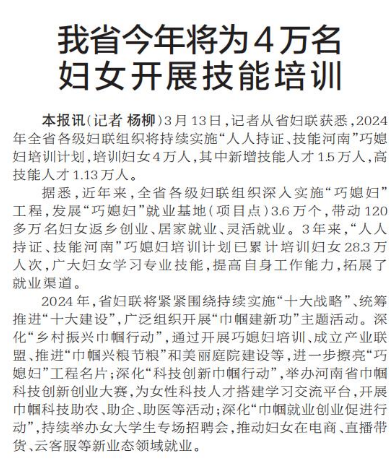 3月13日,记者从省妇联获悉,2024年全省各级妇联组织将持续实施“人人持证、技能河南”巧媳妇培训计划,培训妇女4万人,其中新增技能人才1.5万人,高技能人才1.13万人。(今日《郑州日报》2版)