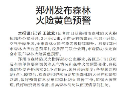 记者昨日从郑州市森林防灭火指挥部办公室获悉,3月份以来,全市无有效降雨,气温回升快,空气干燥多风,全市森林火险气象等级持续攀升。根据《郑州市森林火灾应急预案》,经多部门联合会商,市森防办决定向全市发布森林火险黄色预警。(今日《郑州日报》2版)