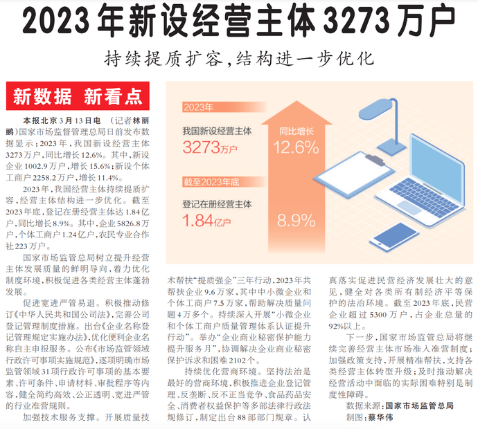 国家市场监督管理总局日前发布数据显示:2023年,我国新设经营主体3273万户,同比增长12.6%。其中,新设企业1002.9万户,增长15.6%;新设个体工商户2258.2万户,增长11.4%。(今日《人民日报》1版)