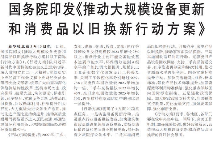 国务院印发《推动大规模设备更新和消费品以旧换新行动方案》