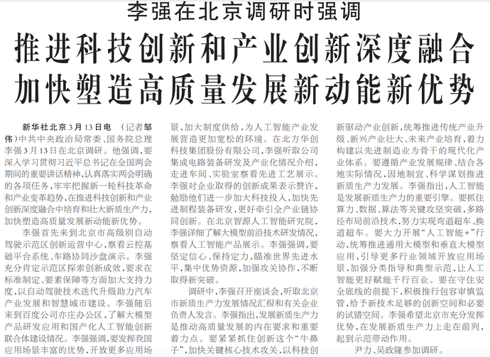 中共中央政治局常委、国务院总理李强3月13日在北京调研。他强调,要深入学习贯彻习近平总书记在全国两会期间的重要讲话精神,认真落实两会明确的各项任务,牢牢把握新一轮科技革命和产业变革趋势,在推进科技创新和产业创新深度融合中培育和壮大新质生产力,加快塑造高质量发展新动能新优势。(今日《人民日报》1版)
