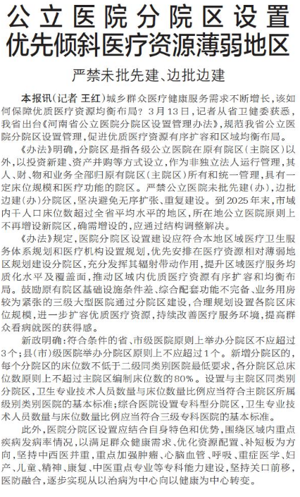 城乡群众医疗健康服务需求不断增长,该如何保障优质医疗资源均衡布局?3月13日,记者从省卫健委获悉,我省出台《河南省公立医院分院区设置管理办法》,规范我省公立医院分院区设置管理,促进优质医疗资源有序扩容和区域均衡布局。(今日《郑州日报》5版)