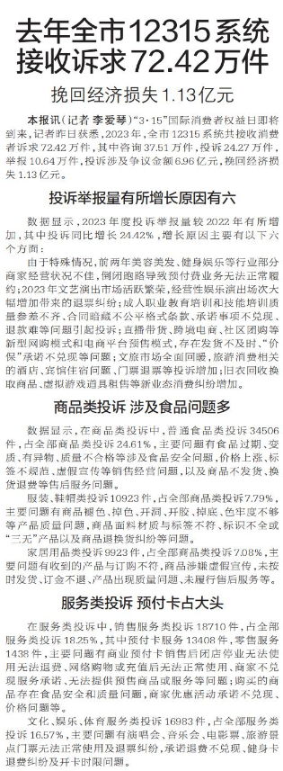 “3·15”国际消费者权益日即将到来,记者昨日获悉,2023年,全市12315系统共接收消费者诉求72.42万件,其中咨询37.51万件,投诉24.27万件,举报10.64万件,投诉涉及争议金额6.96亿元,挽回经济损失1.13亿元。(今日《郑州日报》5版)