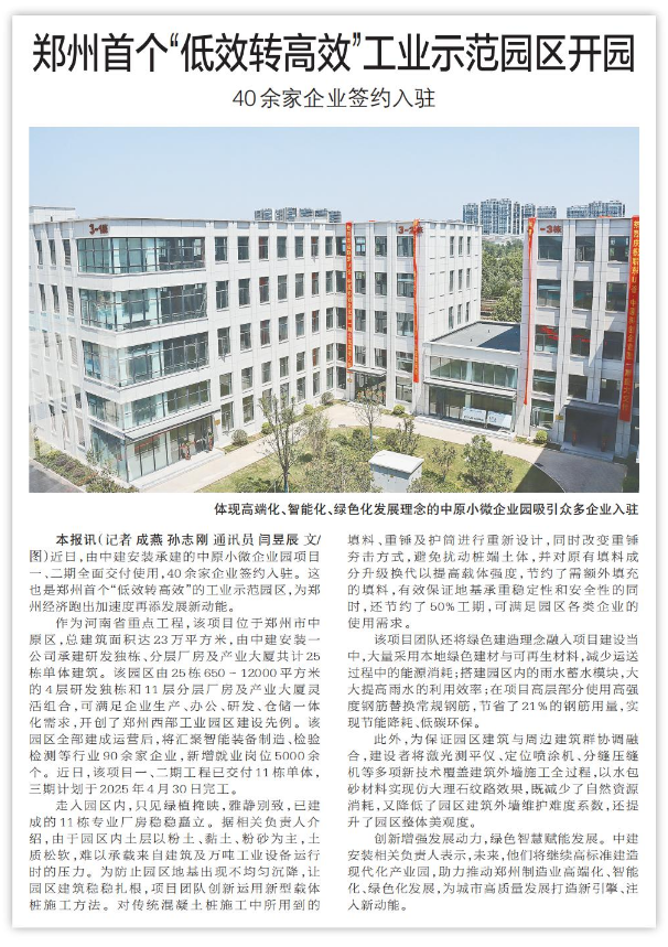 近日,由中建安装承建的中原小微企业园项目一、二期全面交付使用,40余家企业签约入驻。这也是郑州首个“低效转高效”的工业示范园区,为郑州经济跑出加速度再添发展新动能。(今日《郑州日报》5版)