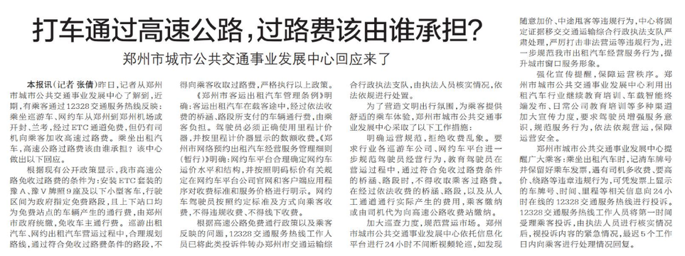 昨日,记者从郑州市城市公共交通事业发展中心了解到,近期,有乘客通过12328交通服务热线反映:乘坐巡游车、网约车从郑州到郑州机场或开封、兰考,经过ETC通道免费,但仍有司机向乘客加收高速过路费。乘坐出租汽车,高速公路过路费该由谁承担?该中心做出以下回应。(今日《郑州日报》5版)