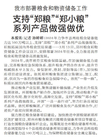 2024年力争市县两级粮食储备能力达100万吨以上、支持“郑粮”“郑小粮”系列产品做强做优、积极拓展国内外粮食贸易渠道……3月13日,郑州粮食和物资储备工作会议召开,安排部署2024年任务,全力推进我市粮食和物资储备高质量发展。(今日《郑州日报》6版)