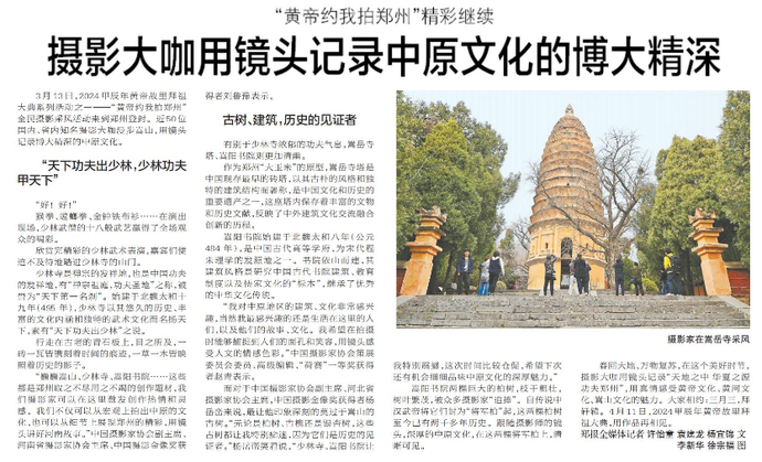 3月13日,2024甲辰年黄帝故里拜祖大典系列活动之一——“黄帝约我拍郑州”全民摄影采风活动来到郑州登封。近50位国内、省内知名摄影大咖漫步嵩山,用镜头记录博大精深的中原文化。(今日《郑州日报》8版)