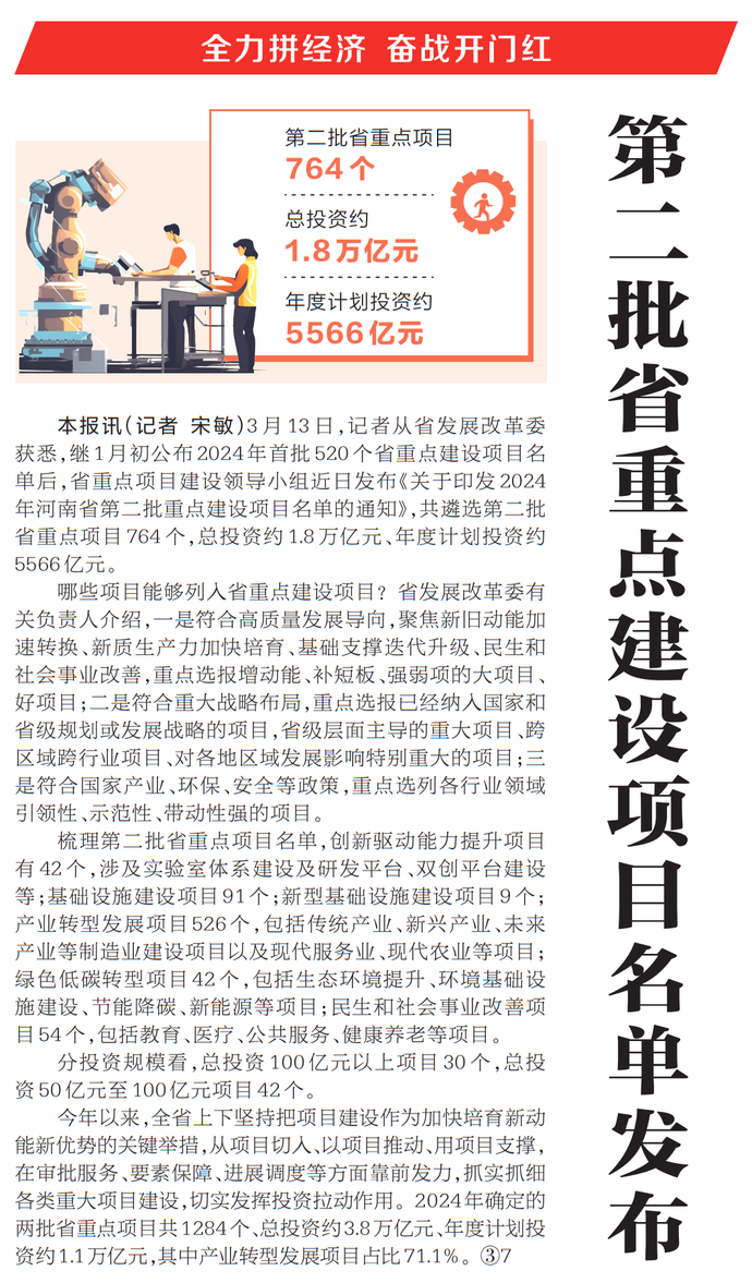 3月13日,记者从省发展改革委获悉,继1月初公布2024年首批520个省重点建设项目名单后,省重点项目建设领导小组近日发布《关于印发2024年河南省第二批重点建设项目名单的通知》,共遴选第二批省重点项目764个,总投资约1.8万亿元、年度计划投资约5566亿元。(今日《河南日报》1版)