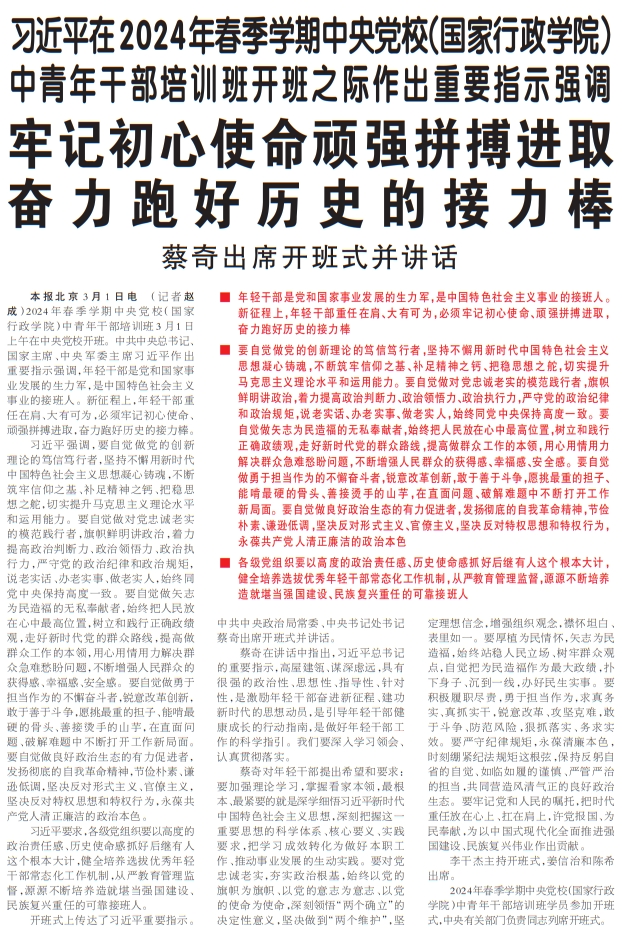 2024年春季学期中央党校(国家行政学院)中青年干部培训班3月1日上午在中央党校开班。中共中央总书记、国家主席、中央军委主席习近平作出重要指示强调,年轻干部是党和国家事业发展的生力军,是中国特色社会主义事业的接班人。新征程上,年轻干部重任在肩、大有可为,必须牢记初心使命、顽强拼搏进取,奋力跑好历史的接力棒。(今日《人民日报》1版)