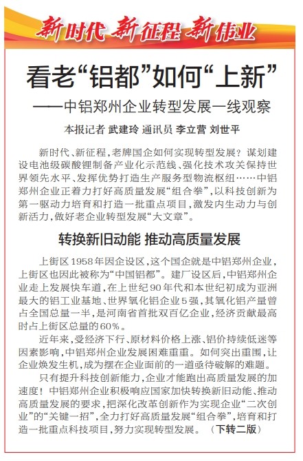 新时代、新征程,老牌国企如何实现转型发展?谋划建设电池级碳酸锂制备产业化示范线、强化技术攻关保持世界领先水平、发挥优势打造生产服务型物流枢纽……中铝郑州企业正着力打好高质量发展“组合拳”,以科技创新为第一驱动力培育和打造一批重点项目,激发内生动力与创新活力,做好老企业转型发展“大文章”。(今日《郑州日报》1版、2版)