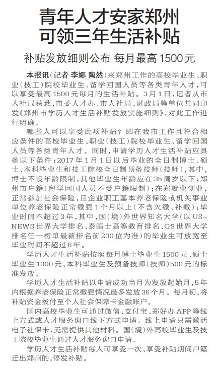 来郑州工作的高校毕业生、职业(技工)院校毕业生、留学回国人员等各类青年人才,可以享受最高1500元每月的生活补贴。3月1日,记者从市人社局获悉,市委人才办、市人社局、财政局等单位共同印发《郑州市学历人才生活补贴发放实施细则》,对此工作进行明确。(今日《郑州日报》1版)