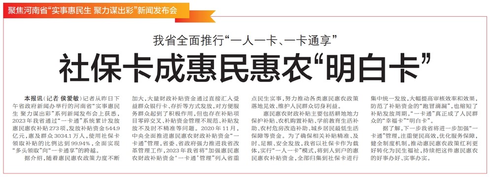 记者从昨日下午省政府新闻办举行的河南省“实事惠民生 聚力谋出彩”系列新闻发布会上获悉,2023年我省通过“一卡通”系统累计发放惠民惠农补贴273项,发放补贴资金544.9亿元,惠及群众3034.1万人,使用社保卡领取补贴的比例达到99.94%,全面实现“多头领取”向“一卡通享”的跨越。(今日《郑州日报》2版)