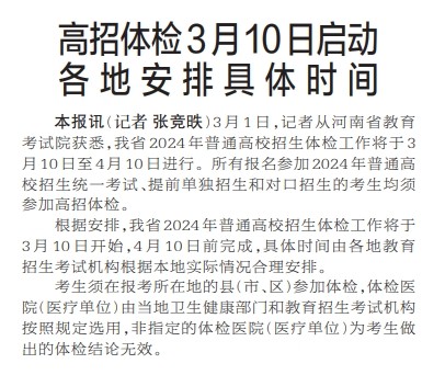 3月1日,记者从河南省教育考试院获悉,我省2024年普通高校招生体检工作将于3月10日至4月10日进行。所有报名参加2024年普通高校招生统一考试、提前单独招生和对口招生的考生均须参加高招体检。(今日《郑州日报》2版)