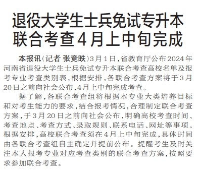 3月1日,省教育厅公布2024年河南省退役大学生士兵免试专升本联合考查高校名单及报考专业考查类别表,根据安排,各联合考查方案将于3月20日之前向社会公布,4月上中旬完成考查。(今日《郑州日报》2版)