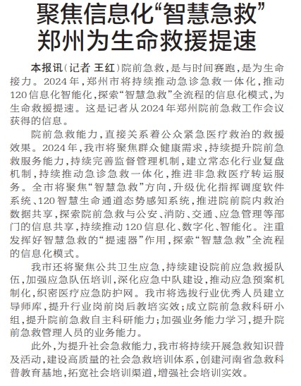 院前急救,是与时间赛跑,是为生命接力。2024年,郑州市将持续推动急诊急救一体化,推动120信息化智能化,探索“智慧急救”全流程的信息化模式,为生命救援提速。这是记者从2024年郑州院前急救工作会议获得的信息。(今日《郑州日报》2版)