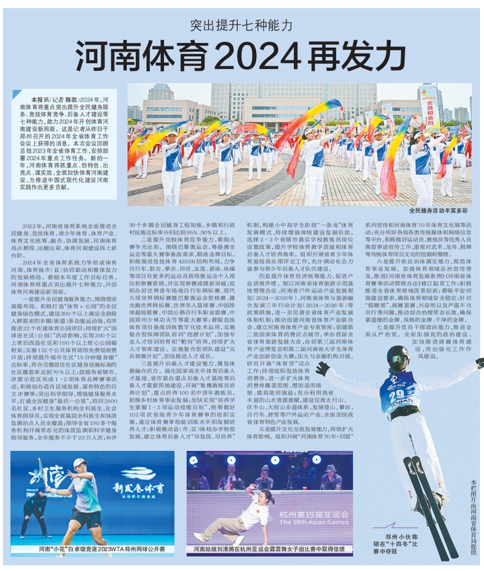 2024年,河南体育将重点突出提升全民健身服务、竞技体育竞争、后备人才建设等七种能力,助力2024年开创体育河南建设新局面。这是记者从昨日于郑州召开的2024年全省体育工作会议上获得的消息。本次会议回顾总结2023年全省体育工作,安排部署2024年重点工作任务。新的一年,河南体育将抓重点、创特色、出亮点、谋实效,全面加快体育河南建设,为推进中国式现代化建设河南实践作出更多贡献。(今日《郑州日报》4版)