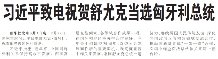 2月29日,国家主席习近平致电舒尤克·道马什,祝贺他当选匈牙利总统。(今日《人民日报》1版)