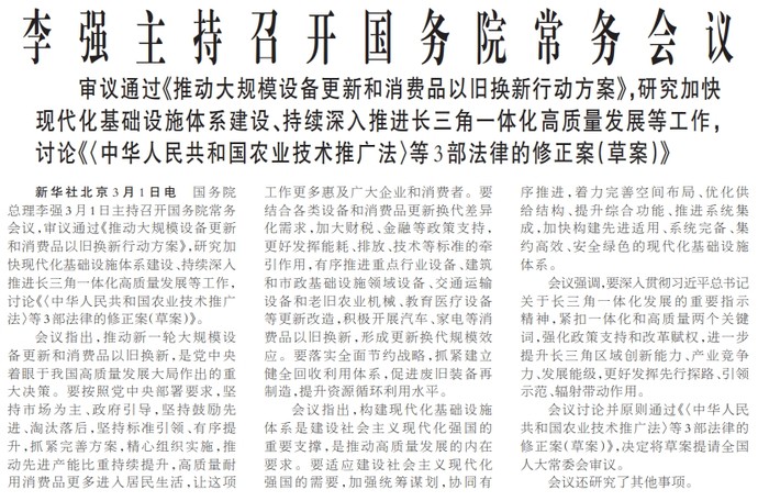 国务院总理李强3月1日主持召开国务院常务会议,审议通过《推动大规模设备更新和消费品以旧换新行动方案》,研究加快现代化基础设施体系建设、持续深入推进长三角一体化高质量发展等工作,讨论《〈中华人民共和国农业技术推广法〉等3部法律的修正案(草案)》。(今日《人民日报》1版)