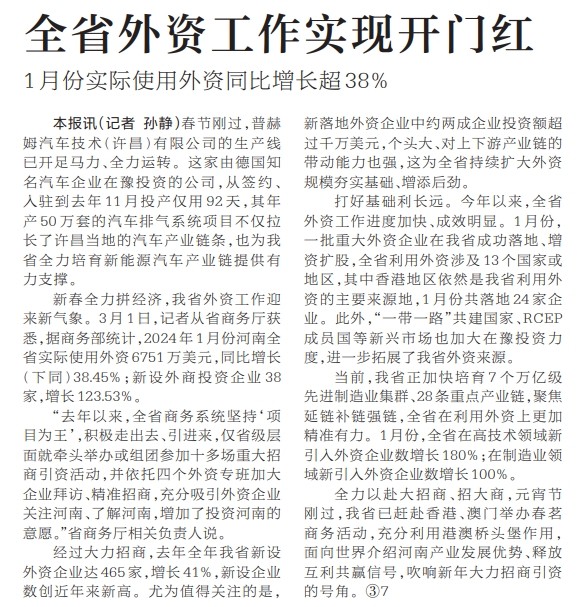 1月份实际使用外资同比增长超38%